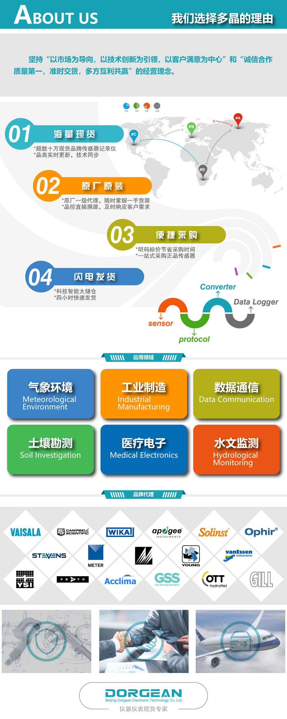 北京多晶電子科技有限公司(Beijing Dorgean Electronic Technology Co., LTD)是一家從事電子與光學(xué)儀器儀表先進(jìn)服務(wù)的授權(quán)代理和經(jīng)銷公司,可在氣象、水文、環(huán)境監(jiān)測、空氣質(zhì)量分析、土壤檢測等領(lǐng)域?qū)δ脑O(shè)施和過程進(jìn)行測試、測量、分析和控制。我們與Meter、Temtop、Acclima、Hash(HACH)、RM.YOUNG、Met One、Apogee、TSI、YSI、Femto、Hukseflux、Delta-T、GILL、Alphasense、Geonor、Ophir、Solinst等全球知名廠商建立了第三方技術(shù)推廣服務(wù)授權(quán)。我們及時(shí)準(zhǔn)確地掌握行業(yè)信息,在廠家的大力支持下已經(jīng)成功地為數(shù)千家機(jī)構(gòu)和企業(yè)提供了各種產(chǎn)品、咨詢、解決方案和服務(wù)。