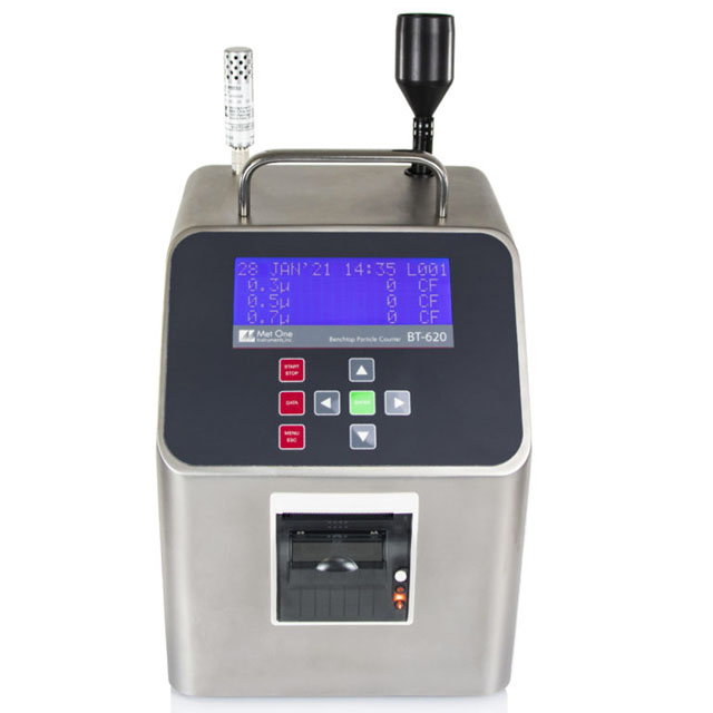 BT-620 是一款緊湊型、電池供電的粒子計數器,具有六個可選擇尺寸的通道、一個集成打印機,并裝在一個便攜式不銹鋼外殼中。該設備的流速為 1.0 CFM (28.3 LPM),并通過體積流量控制保持以提高準確性。這款臺式粒子計數器具有易于閱讀的大型顯示屏、聲音警報和內部打印機,可協同工作以驗證粒子水平。如果顆粒計數多于用戶預設的限值,聲音警報就會響起,屏幕顯示、采樣歷史記錄和打印輸出將指示警報事件。可以設置兩個可編程計數警報限值。