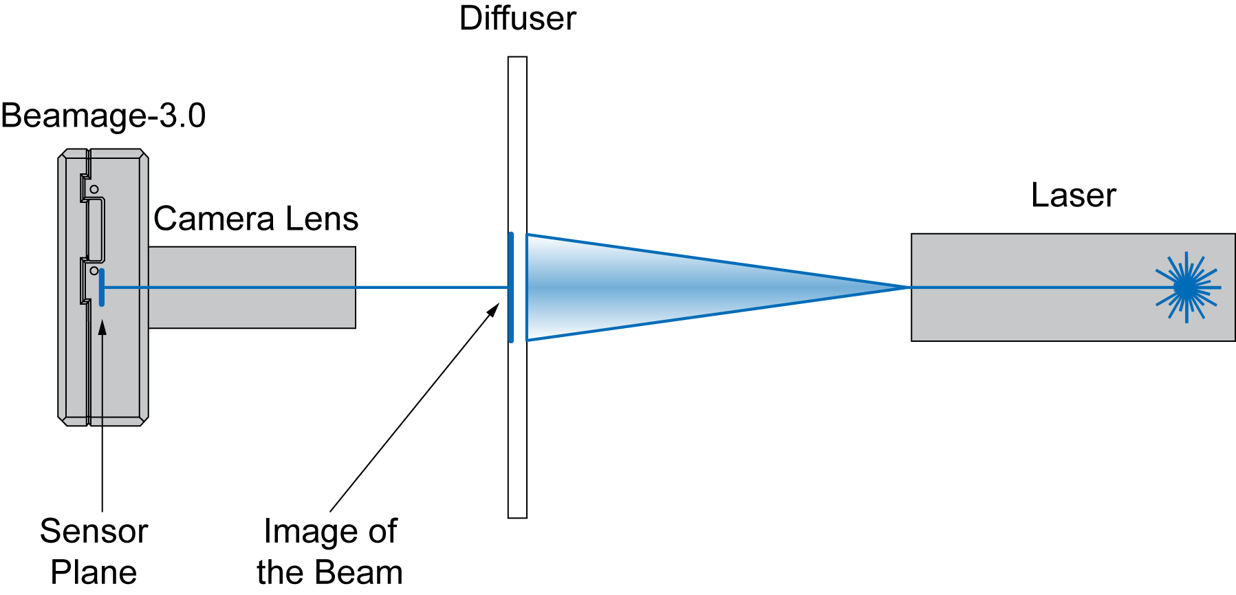 CL 系列相機(jī)鏡頭的工作原理是在光束射入漫射元件之后,間接對(duì)光束的反射或透射進(jìn)行成像。對(duì)于較大光束,只需增加漫射體與 BEAMAGE 之間的距離。