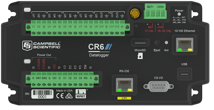 CR6 測量和控制數據記錄器是數據采集系統的強大核心組件。CR6 數據記錄器提供快速通信、低功耗要求、內置 USB、緊湊的尺寸以及高模擬輸入精度和分辨率。它使用通用 (U) 端子允許連接到幾乎任何傳感器——模擬、數字或智能。這種多用途數據記錄器還能夠進行靜態振弦測量。