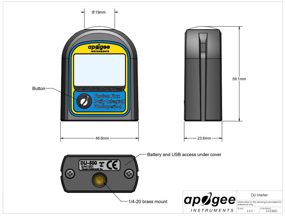 堅固耐用且隨時可用:DLI-400 堅固耐用,防護 等級為 IP65,可承受惡劣和潮濕的環境,可以隨身攜帶進行抽查,直接放置在任何水平表面上,或通過連接到常用的相機三腳架、夾具或使用底部的標準 ?-20 螺紋端口進行樁子。DLI 儀表由鑄造丙烯酸擴散器(過濾器)、光學過濾器、光電二極管、信號處理電路和安裝在 ASA 塑料外殼中的 LCD 顯示屏組成。每個 DLI 包裝都包括儀表、一個保護性手提箱、兩節 AAA 電池、一個快速入門說明指南、一把螺絲刀、一個便于安裝的土壤釘和一根 USB-C 電纜,用于將儀表存儲的數據作為 CSV 文件下載到計算機。