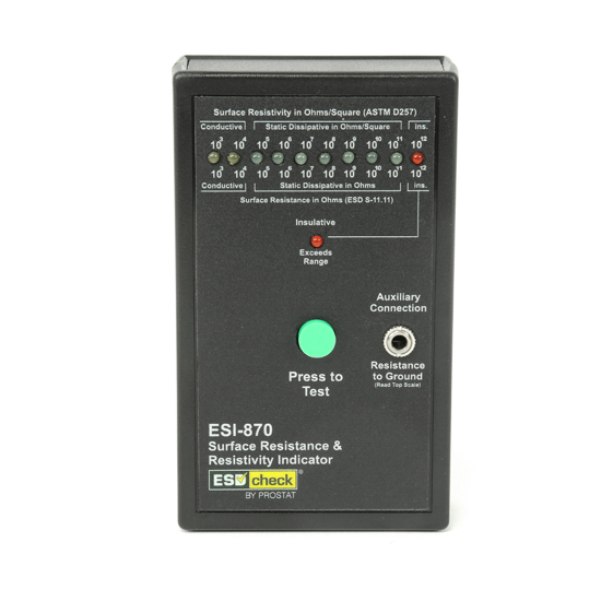 指示表面電阻 ESI-870 電阻/電阻率指示器是一種 LED 指示、寬范圍電阻測量儀器,具有廣泛的應用靈活性。它根據 ANSI/ESD STM11.11 測量表面電阻,根據 ASTM D-257 測量表面電阻率、接地電阻和點對點電阻。