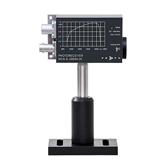 HCA-S-400M 光接收器系列將快速光電二極管與久經考驗的FEMTO HCA 電流放大器技術相結合。HCA-S-400M 可配備快速硅或 InGaAs 光電二極管,分別覆蓋 320 至 1000 nm 和 900 至 1700 nm 的光譜范圍。放大器跨阻抗為 5 x 103 V/A,導致InGaAs 模型在 1550 nm 時的最大轉換增益為 4.8 x 103 V/W,而 InGaAs 模型為 2.7 x 103帶有硅光電二極管的模型在 800 nm 時的 V/W。復雜的直流耦合多級放大器設計允許測量從直流到 400 MHz 的帶寬,對應于 1 ns 的最小上升時間。由于采用低噪聲設計,無需進一步平均即可檢測到光功率在微瓦范圍內的信號。提供具有自由空間或光纖輸入的不同型號。