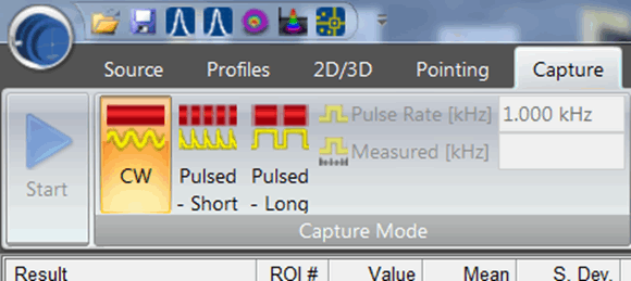 是否可以觸發 NanoModeScan 單元來捕獲脈沖源?NanoScan 可以捕獲高重復率脈沖激光源,但不能由激光本身觸發。要在 NanoScan 上捕獲脈沖源,您必須在“捕獲”選項卡下選擇一種脈沖設置。激光脈沖率也必須大于 100 kHz。