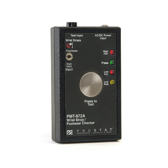 PMT-872 是一款獨特、高度便攜、電池供電的多功能 PASS/FAIL 性能驗證器。它確認(rèn)了腕帶、腳跟帶和 ESD 控制鞋類的工作阻力范圍。 PMT-872 具有一個大的測試按鈕、帶有綠色 PASS 燈的可聽見的 PASS 嗶嗶聲、紅色低電平和高電平故障燈以及黃色電池電量低指示燈。為可選的 AC-DC 電源適配器和測試雙導(dǎo)制腕帶提供了額外的連接。前面板撥動開關(guān)允許在一個工位上測試腕帶和鞋類。鞋類測試板、卡扣連接器和引線可以單獨購買。