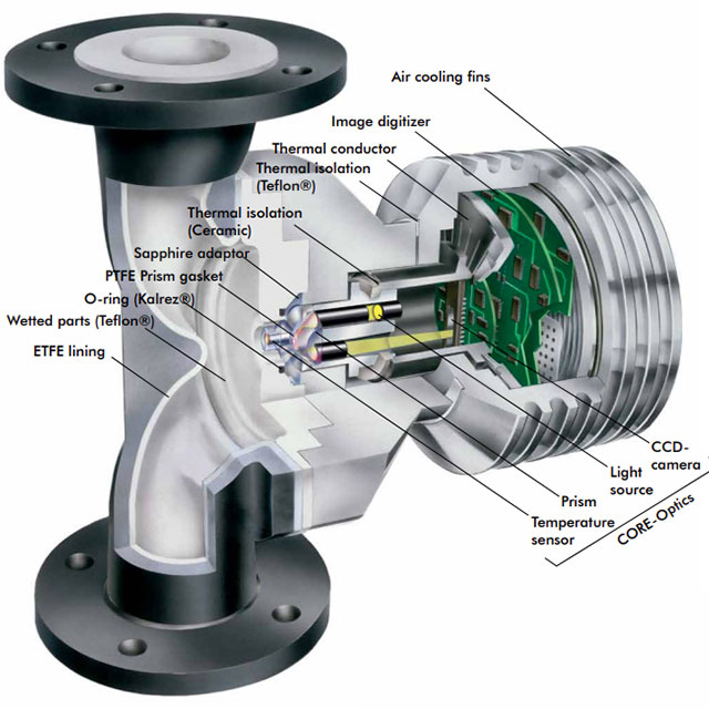 PR-23-W 傳感器接液部件:Teflon®、藍(lán)寶石 (Al2O3)、Kalrez® 和尖晶石 (MgAl2O4) 具有良好的化學(xué)物質(zhì)耐受性和機(jī)械耐受性;PR-23-M 傳感器接液部件:Teflon® PTFE 或 Kynar® PVDF(聚偏二氟乙烯)、棱鏡墊片 Teflon® PTFE、藍(lán)寶石棱鏡、O 形圈 Kalrez 和藍(lán)寶石適配器