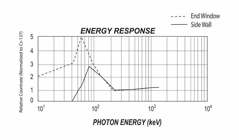 | 探測(cè)器 | 內(nèi)部鹵素淬火、無補(bǔ)償 GM 管,帶薄云母窗,面密度1.4-2.0 mg/cm 2> 。窗口的有效直徑為 45 毫米(1.77 英寸)。 |