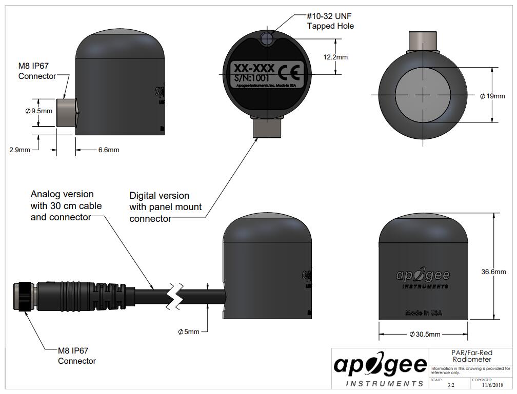 S2-441 PAR-FAR 傳感器是一款雙通道數(shù)字傳感器,用于使用 SDI-12 通信協(xié)議測量電動植物生長燈的 PAR (PPFD) 和遠紅光輸出。該傳感器采用堅固的鋁制外殼,可完全浸入水中,可承受惡劣條件,并采用預鍍錫尾纖引線的高質(zhì)量電纜端接,可輕松連接到數(shù)據(jù)記錄器和控制器。傳感器電纜包括一個 IP68 不銹鋼電纜連接器,以簡化從持久安裝中拆卸和更換傳感器以進行維護和校準的過程。 PAR-FAR 傳感器的典型應用包括測量傳統(tǒng)的 PPFD 光合光子通量和單獨量化遠紅外光子 (700-750 nm) 的光子通量。輸出包括傳統(tǒng)的量子通量、遠紅光子通量和遠紅部分(遠紅光子通量密度/PPFD 和遠紅光子通量密度之和)。該傳感器量化遠紅光子,對于許多應用,它減少了使用光譜輻射計進行更復雜測量的需要。