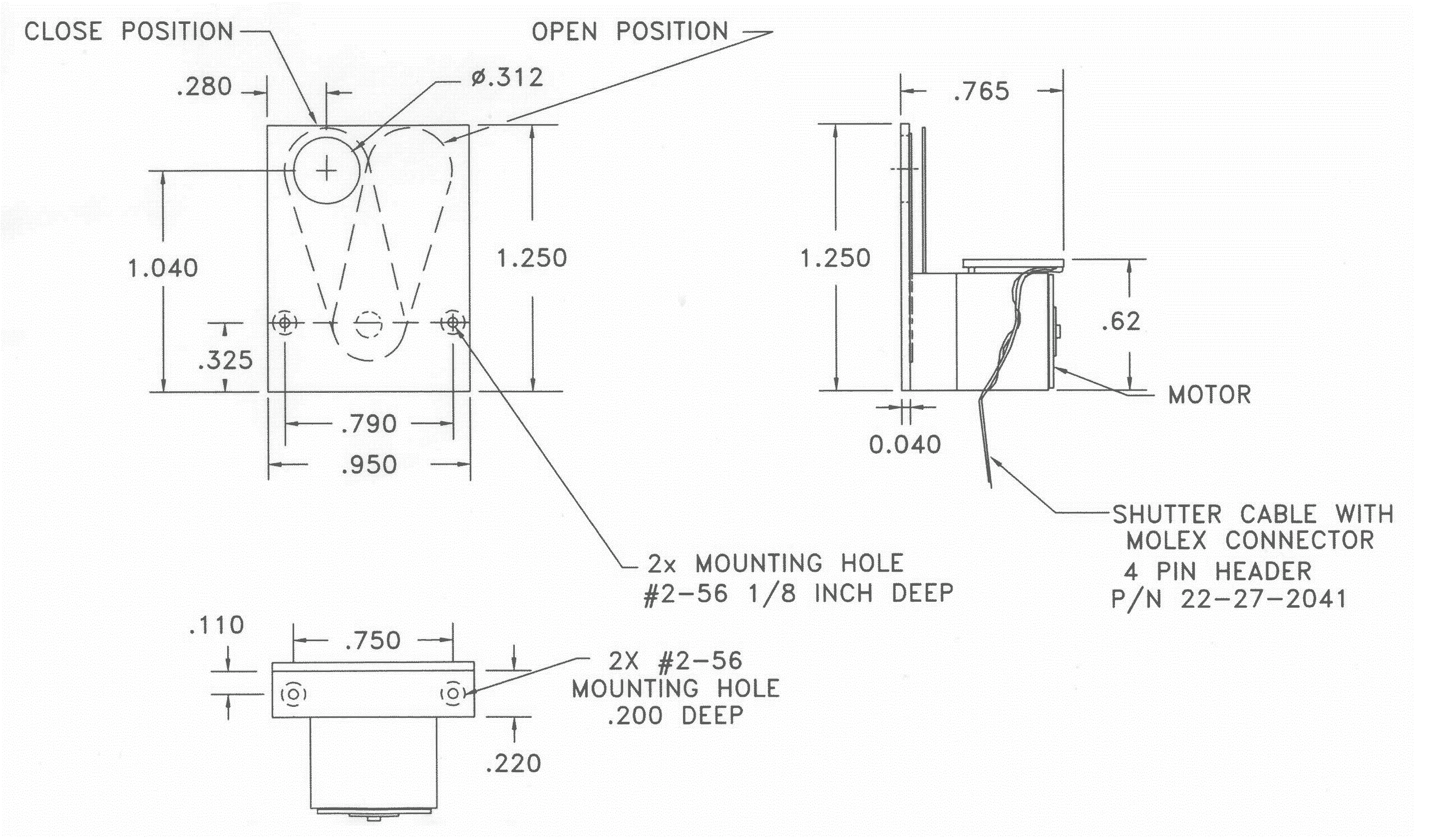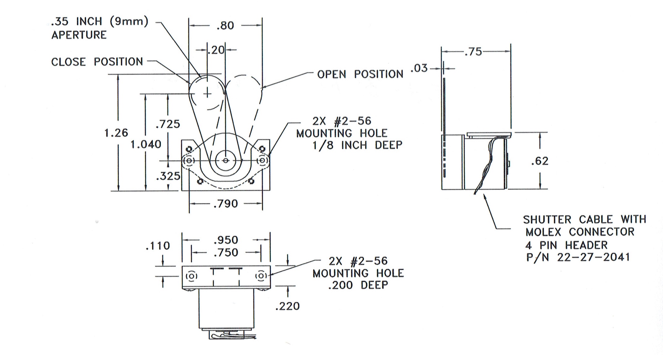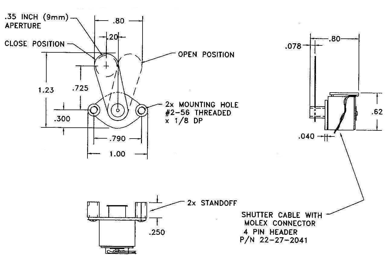 示例 1:零件編號帶 DSH-35-PC 的 SH-35 此部件號指定了型號 SH-35 快門,具有 0.010 英寸厚的黑色陽極氧化鋁葉片和用于水平和垂直安裝的前板。DSH-35 驅動器是一款 3.93“ x 2.6” 填充的印刷電路板驅動器,由外部 15 VDC 電源供電。