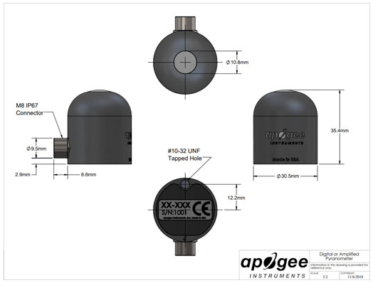 Apogee Instruments SP系列日冕計由鑄造丙烯酸擴散器(濾波器),光電二極管和信號組成 處理電路安裝在陽極氧化鋁外殼,和電纜連接傳感器到一個 測量設備。傳感器是盆栽固體,沒有內部空氣空間,是專為連續總 室外環境中平面上短波輻射的測量。SP系列傳感器輸出 與太陽總短波輻射成正比的模擬電壓。電壓信號來自 傳感器與入射在平面上的輻射成正比(不一定是水平的),其中 輻射從一個半球的各個角度發出。
