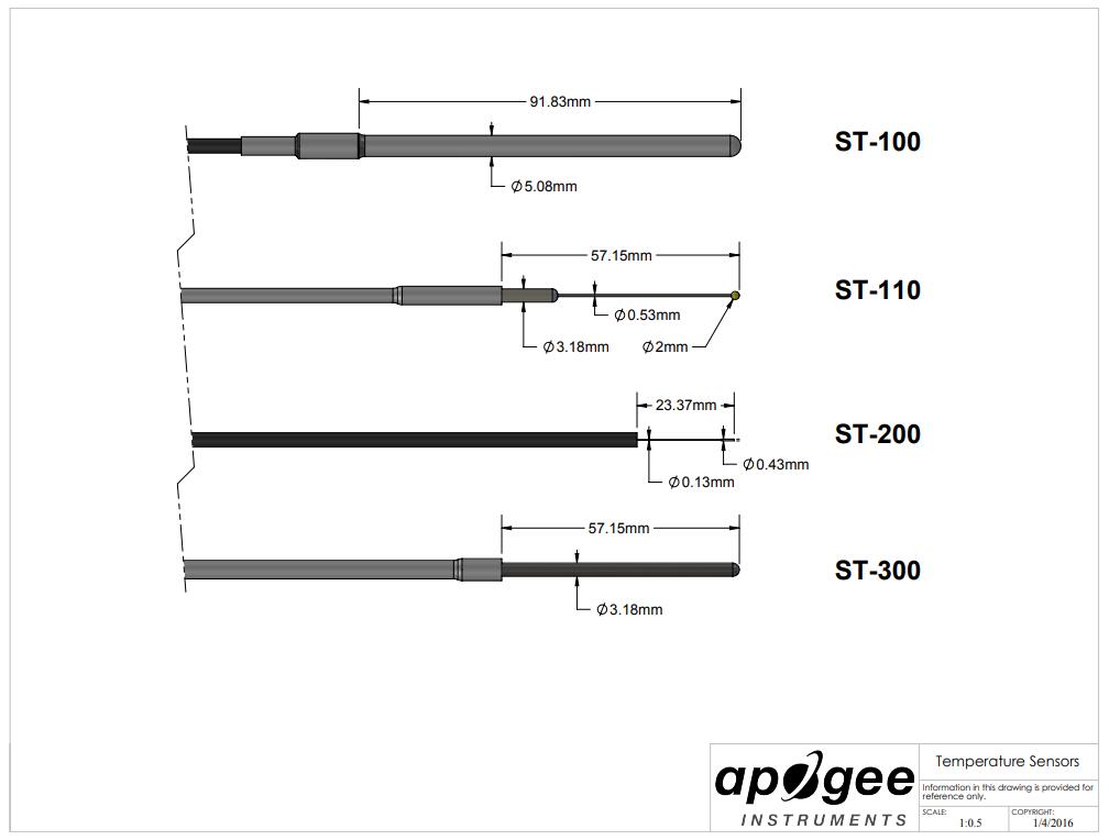 ST-110 是一款高精度熱敏電阻(-40 至 60 C 范圍內為 ± 0.1 C),旨在很大限度地減少太陽能負載和熱傳導。在熱敏電阻后面的電纜上使用白色熱縮管以減少太陽能負載??点~線用于很大限度地減少沿著電線向熱敏電阻的熱傳導。ST-110 設計用于在 Apogee 的 TS-100 吸氣輻射防護罩中進行空氣溫度測量,也可用于其他公司的靜態多板防護罩。