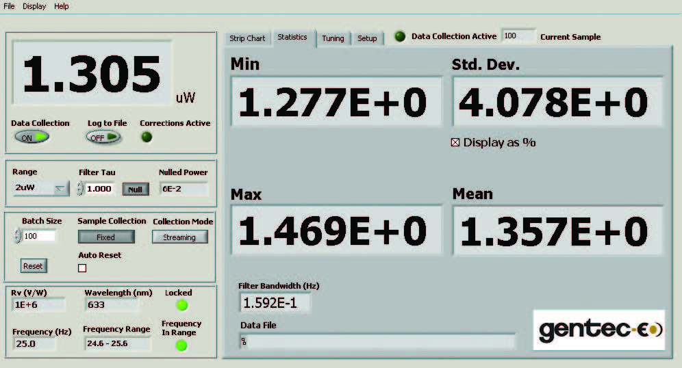 在“統計數據”選項卡下,有 4 個包含所選批次統計數據的大窗口,分別為:小值、大值、標準差和平均數,以工程計數法表示。用戶可選擇以瓦或 % 來顯示標準差。另外還有一個窗口可以根據用戶選擇的“Tau 過濾器”(0.100 至 100 秒)顯示數字帶通過濾器的帶寬。設置時,應使用較小的時間常數;進行測量時,應使用較大的時間常數,特別是在儀器的量程低端。
