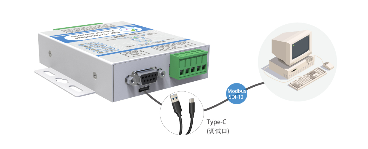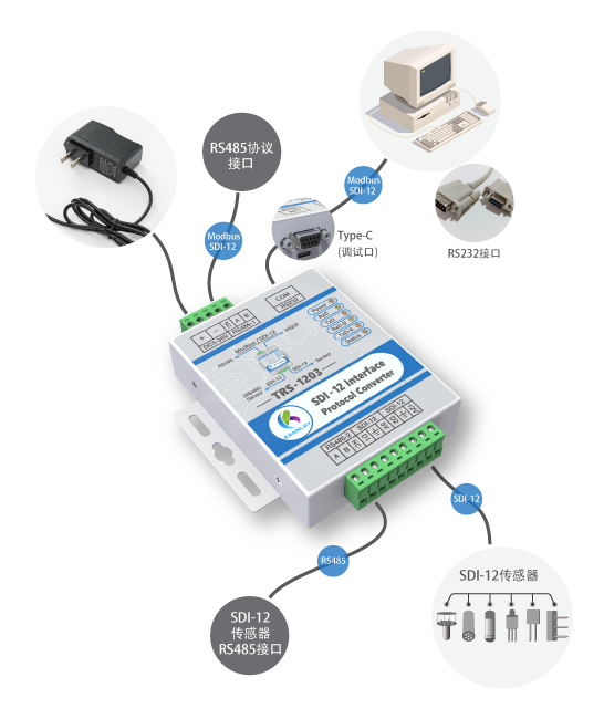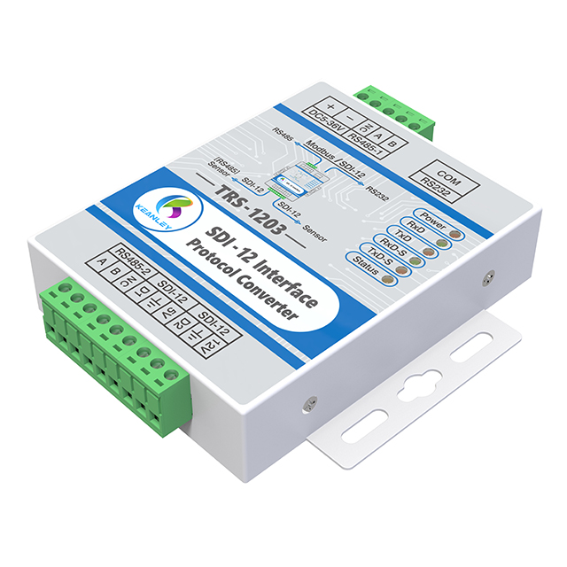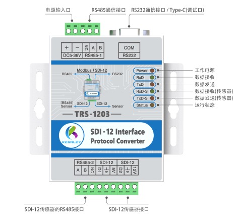 KEANLEY TRS-1203 接口轉換器可與SDI-12傳感器以及485傳感器連接,電腦端有三個接口:USB、RS232、RS485總線,通信協議可支持Modbus協議和SDI-12標準協議。