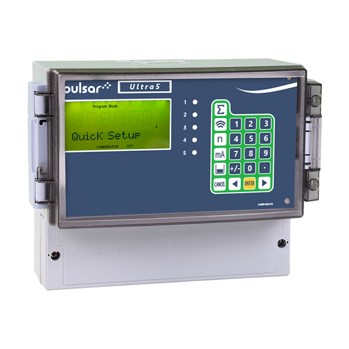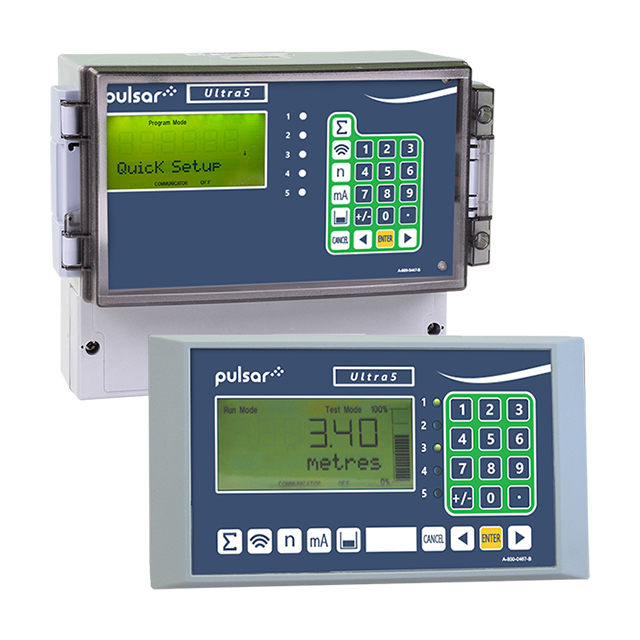 Ultra 5 集泵控制、流量測量、液位控制、體積計算和差液位測量于一體。控制單元提供五個可分配的繼電器,具有額外的報警選項,如泵效率和額外的泵控制功能,如泵運行、泵運動、風暴和曝氣控制以及差液位控制;在明渠流應用中增加更多繼電器。