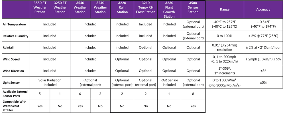完全集成的 WatchDog 3550 無線 ET 站可測量溫度、濕度、降雨量和風速/風向。它使用其內部調制解調器或無線電記錄數據并將其傳送到云端。使用這些傳感器,SpecConnect 可以計算蒸散量 (ET),指示離開田地的水量。