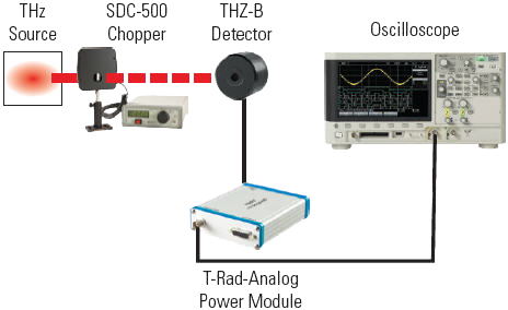 這是一種基本模擬設(shè)置,在輻射源的光功率約為 5 微瓦或更大的情況下比較有用。在 5 赫茲斬波頻率下,THZ5B-BL-DA 探測(cè)器的輸出約為 600 毫瓦,可為示波器提供充足的信號(hào)。只需讀取電壓輸出,再除以探測(cè)器的 Rv 系數(shù) (V/W),即可測(cè)量出輻射源的強(qiáng)度(單位:瓦)。在特定情況下,還可考慮使用波長(zhǎng)糾正系數(shù)。