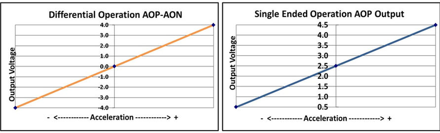 These Accelerometers produce differential analog output voltage pairs (AON & AOP) which vary with acceleration. The signal outputs are fully differential about a common mode voltage of approximately 2.5 volts. At zero acceleration, the output differential voltage is nominally 0 volts DC; at ±full scale acceleration, the output is ±4 volts DC, respectively, as shown in the figure (below). The output scale factor is independent from the supply voltage of +8 to +32 volts.