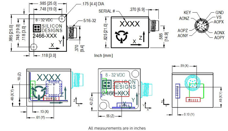Each SDI 2460 and 2466 triaxial accelerometer features three orthogonally mounted low noise accelerometers within a single, rugged, epoxy sealed, anodized aluminum case. Onboard voltage regulation and an internal voltage reference eliminate the need for precision power supplies. They are relatively insensitive to temperature changes and gradients. Individual axis directions are marked on the case with positive acceleration defined as acceleration in the direction of the axis arrow. The robust, anodized aluminum case is epoxy sealed and can be mounted easily via two screws, an adhesive, or by attaching a magnet.