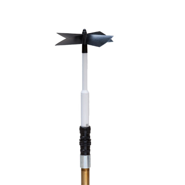The YOUNG Model 27106T Gill Propeller Anemometer (CFT) utilizes a fast response helicoid propeller and high quality tach-generator transducer to produce a DC voltage that is linearly proportional to air velocity. Airflow from any direction may be measured, however, the propeller responds only to the component of the air flow which is parallel to its axis of rotation. Off-axis response closely approximates a cosine curve with appropriate polarity. With perpendicular air flow the propeller will not rotate. The output signal is suitable for a wide range of signal translators and data logging devices. The Model 27106T utilizes a carbon fiber thermoplastic (CFT) propeller for greater range and durability.