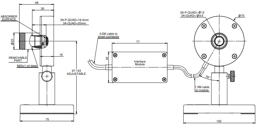 The BeamTrack series 3A-P-QUAD laser measurement sensor measures laser beam position well as power and energy. It has a 12mm aperture and can measure beam position to 0.15mm accuracy. It measures power from 160μW to 3W and energy from 30μJ to 2J. It has the P type volume absorber that covers the spectral range from 0.15 to 8μm. The sensor comes with a 1.5m cable that connects it to the electronic box, and another 0.5m cable that connects the box to a Meter or PC interface.