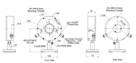 The BD5000W-BB-50 is a water cooled beam dump with a 50mm aperture for up to 5000W. It can withstand 3kW/cm2 at full power and has a spectral range from 0.19 - 20μm.