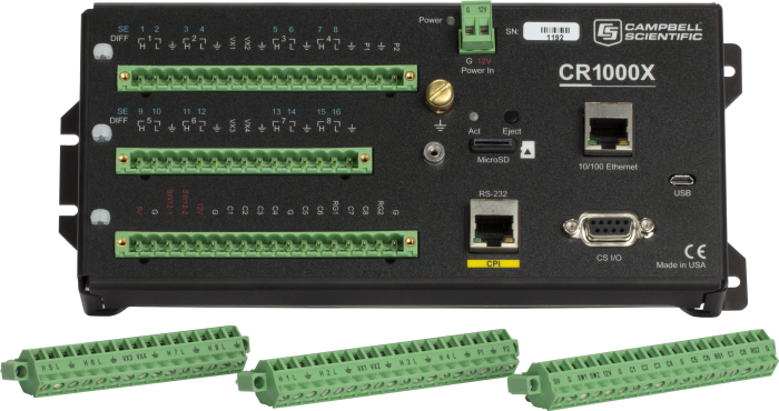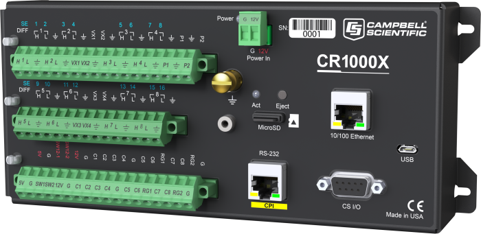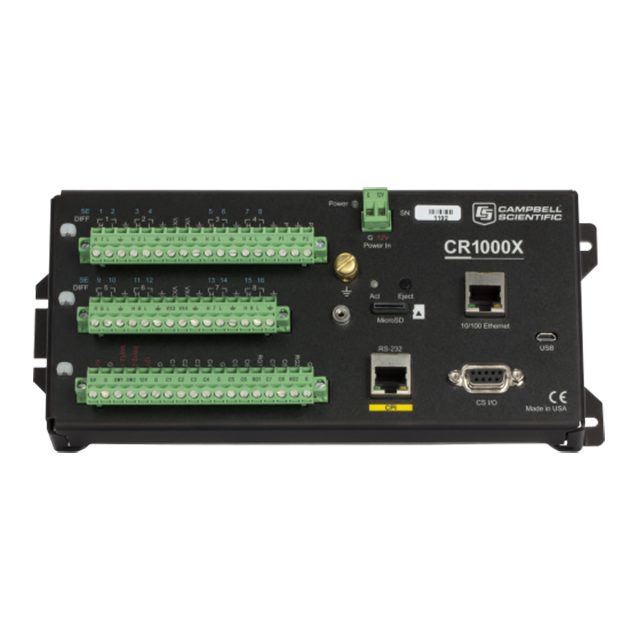 The CR1000X is a low-powered device designed to measure sensors, drive direct communication and telecommunications, analyze data, control external devices, and store data and programs in on-board, non-volatile storage. The electronics are RF-shielded and glitch-protected by a unique sealed, stainless-steel canister. A battery-backed clock assures accurate timekeeping. The on-board, BASIC-like programming language—common to all Campbell Scientific data loggers—supports data processing and analysis routines.The CR1000X wiring panel includes two switchable 12 V terminals, analog grounds dispersed among 16 analog terminals, and unpluggable terminal blocks for quick deployment.