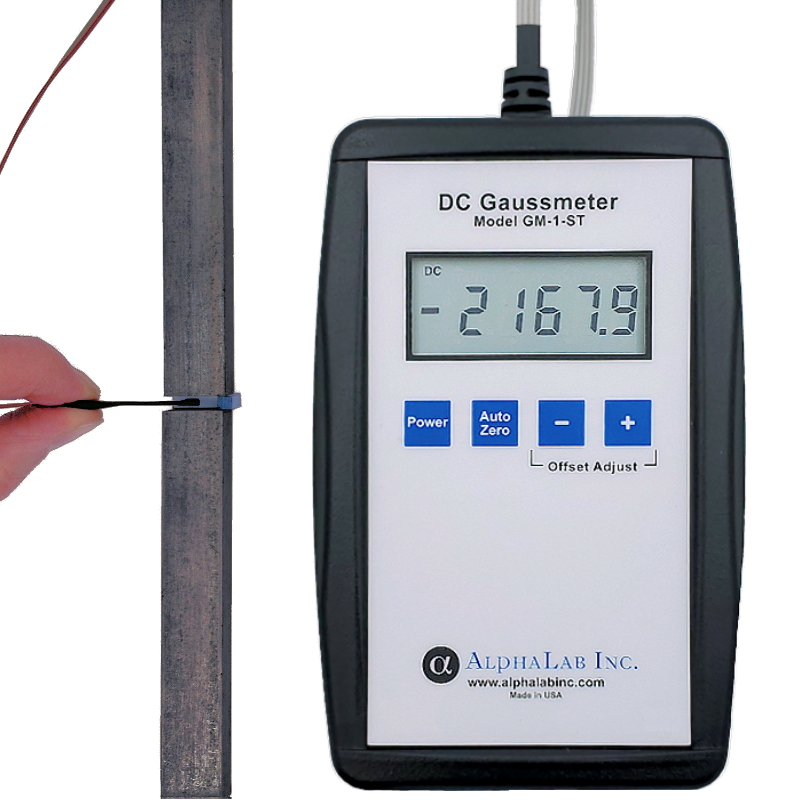 The DC Gaussmeter Model GM1-ST is measures strength and polarity of magnetic fields up to 19,999.9 gauss. The sensor can easily fit in a .060 inch (1.5 mm) gap and is at the end of a 100 cm flexible cable. The sensor end can be bent if required for a variety of situations. Place the sensor on a magnet face to measure the field. With a resolution of 0.1 gauss, it can measure any tiny variation from magnet to magnet or it can detect if a given magnet has lost even a little strength. Bend the sensor in to a “L” to measure inside a DC solenoid tube. The 5 ? digit display requires neither auto nor manual range change, making it easier to use than older style 3 ? or 4 ? digit meters. Turn on the meter and immediately begin reading fields (updates 4 times per second). There is no setup required, making this the fastest, easiest gaussmeter available.