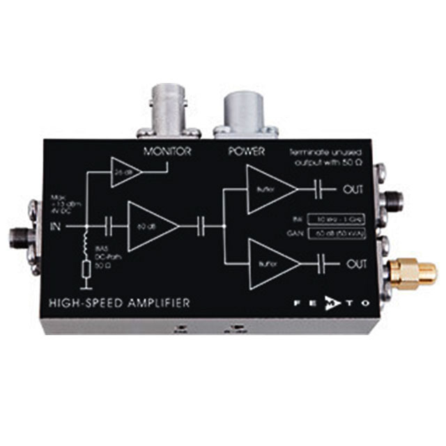 HSA-YIn addition to the features of the HSA-X the HSA-Y is equipped with a DC-monitor output useful for photodetector alignment or cw-power control or for the measurement of low frequency background signals. Furthermore, the HSA-Y features two identical signal outputs enabling signal control or triggering without the need for an external signal splitter. The HSA-Y series offers various models with a fixed gain of either 20, 40 or 60 dB.