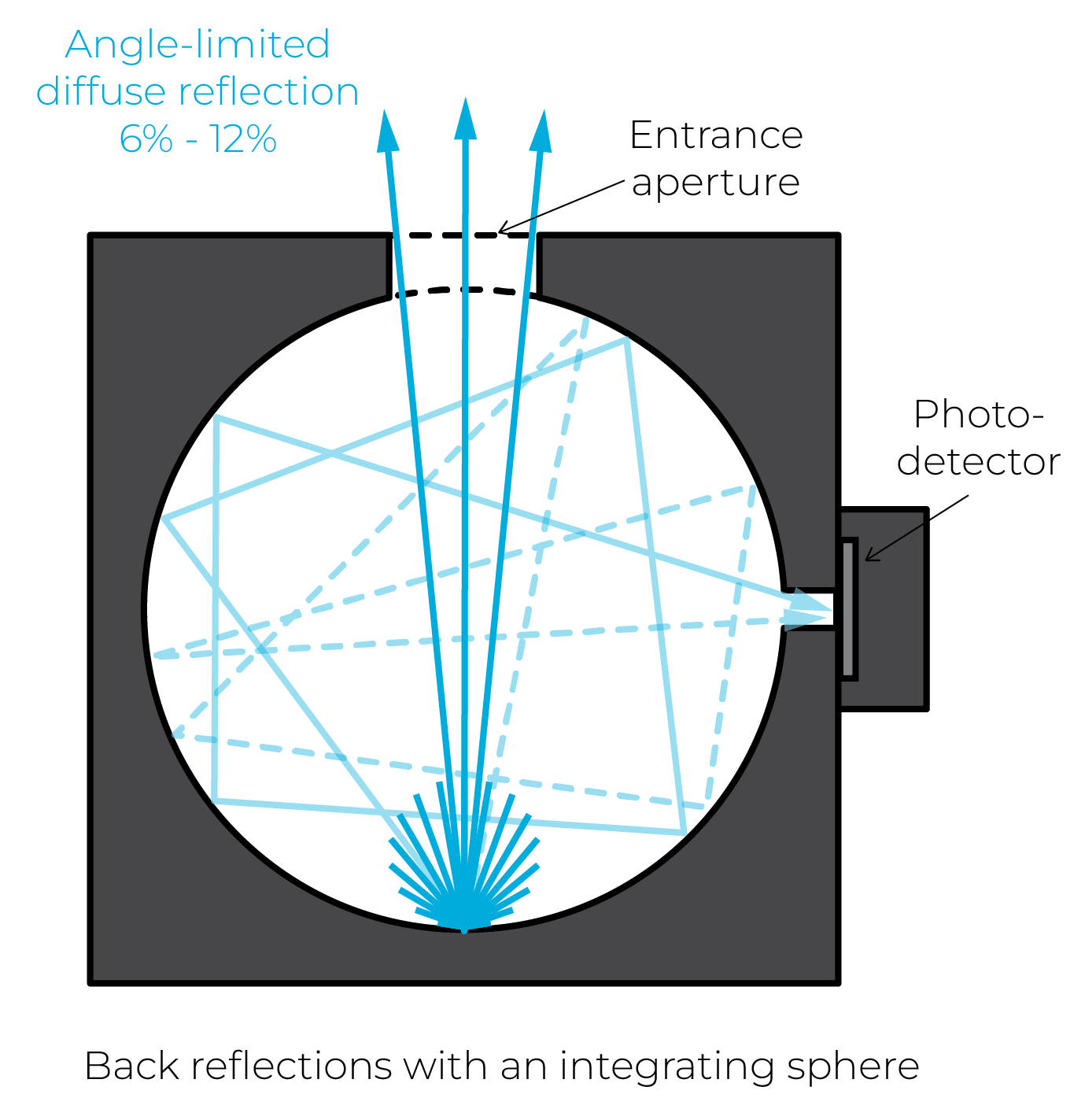 While thermal detectors and water calorimeters diffusely reflect 10% to 15% of the incoming light in a Lambertian manner, integrating spheres of the IS series reflect only 6% to 12% more directionally through their optical aperture. This helps improve safety in the measurement environment by making it easier to deal with back reflections.