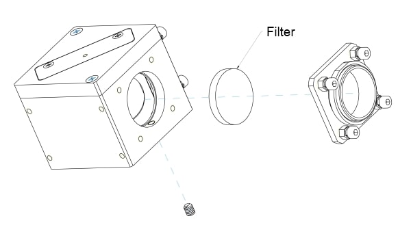 A filter well (see diagram below) is integrated into each input port so that a φ1” or φ25mm optical filter can be inserted in between the LED source and the beam splitter. Narrow band filters and polarizers may be used to clean up LED spectrum or change the polarization state of the output beam. Here are the dimension requirement for the dichroic/beamsplitters to be fit into the beam combiner cubes: