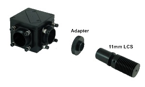Currently, Mightex’s multi-wavelength beam combiners can only be used to DIRECTLY combine 22mm-diameter Collimated LED Sources. For 11mm-diameter collimated LED sources, (as shown below) a mechanical adapter (P/N: ACC-BC25-011) can be used to attach the LED sources to the beam combiners, before the 11-mm diameter collimated LED sources can be combined. We don’t yet have beam combiners for 38mm- and 48mm-diameter collimated LED sources.