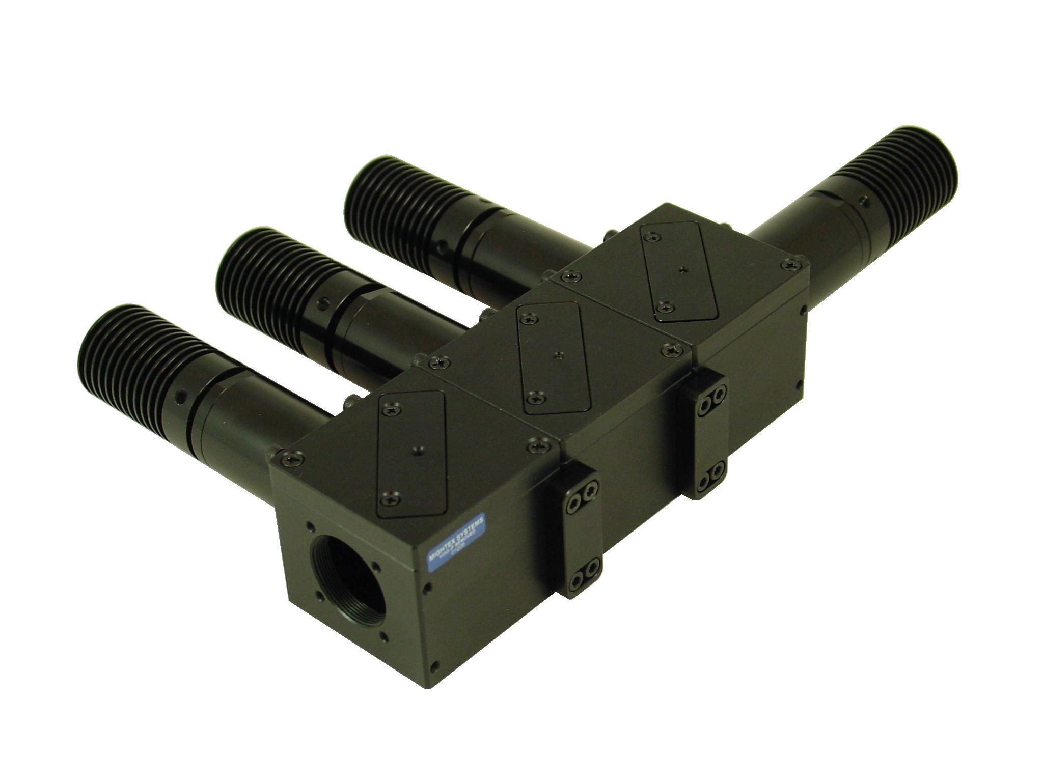 The beam combiner includes multiple mounting holes and threads so that it can be easily integrated into a system. Each input port features a fine 2-axis tilt adjustment to allow precise alignment of the LED collimator sources relative to system optical axis. A robust locking mechanism is also provided to maintain alignment over time. Additionally, adapters are also available for coupling to major brands of microscopes.