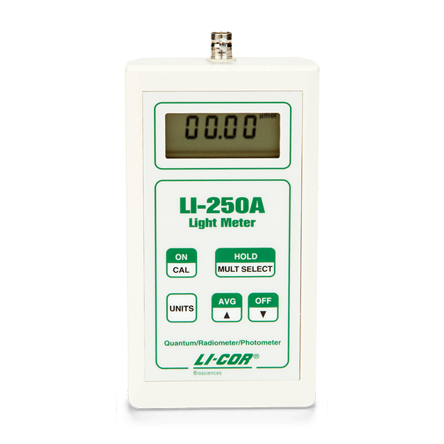 The LI-250A is a portable meter that displays the output from any LI-COR light sensor that has a cable terminated with a BNC connector. It shows instantaneous values or 15-second averages of values from a sensor.