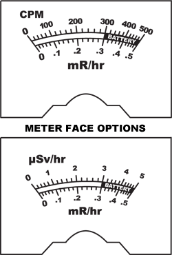 0-.5, 0-5, 0-50 mR/hr 0-500, 0-5,000, 0-50,000 CPM or 0-5, 0-50, 0-500 μSv/hr (SI Scale Meter Option) |