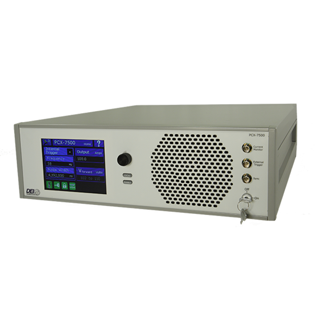 The PCX-7500 is an air-cooled, high power pulsed current source designed to drive laser diodes, bars, and arrays. The output current can be set from 10 A to 450 A, compliance voltage is 102 V to 110 V. The pulse width is adjustable between 4 μs to 5,000 μs, with a frequency of 8 Hz to 10,000 Hz.