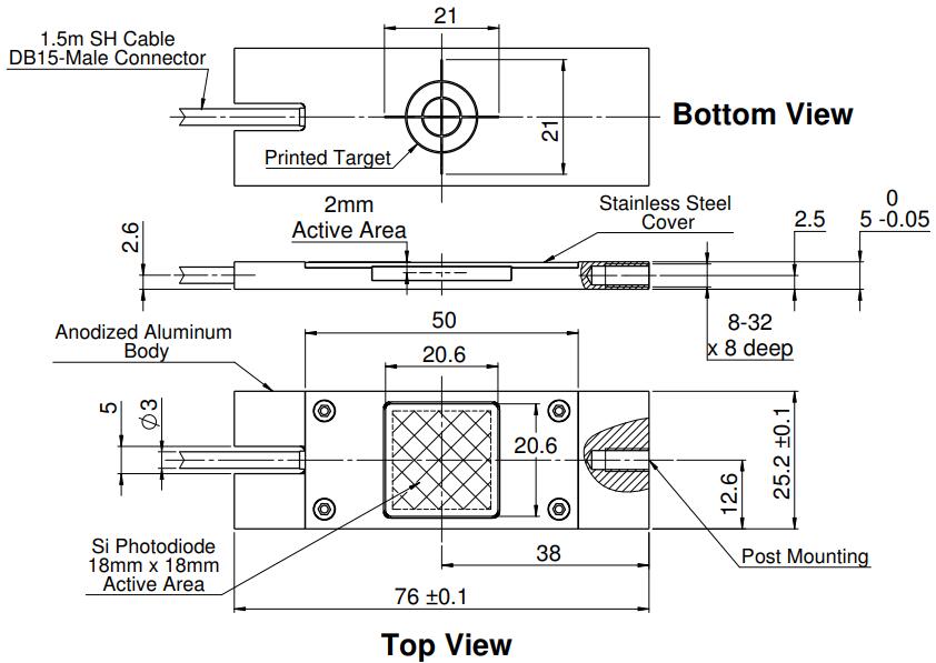 The thin power sensor has a footprint of 76.0 mm x 25.2 mm matching that of a standard microscope slide. The sensing area is sealed and cleanable, allowing it to easily measure the output of high NA objectives that use immersion medium such as water / oil / glycerol as well as in air.