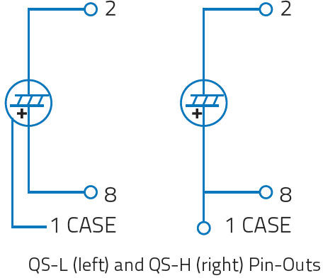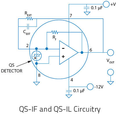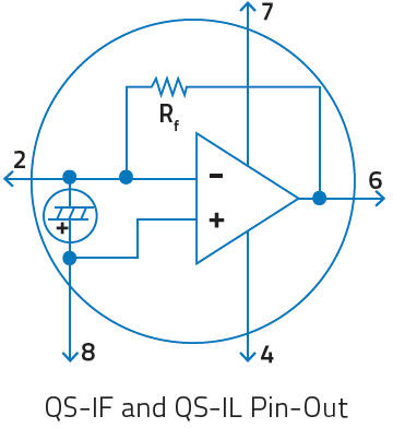 Our QS-VL and QS-IL hybrid detectors are designed to maximize voltage output at low frequencies and therefore include load and feedback resistors in the 100 GΩ to 300 GΩ range. They are also designed into 8-pin TO packages that allow the addition of an “external resistor” to lower the output and increase the bandwidth. The circuit diagram at the left shows a typical hook up for our QS5-IL detector (with our MT coating), using external resistors and capacitors. Our QS-IF series, on the other hand, are designed for high bandwidth applications and therefore include a smaller feedback resistor of 100 MΩ. For expert help on designing a detector circuit please contact us.