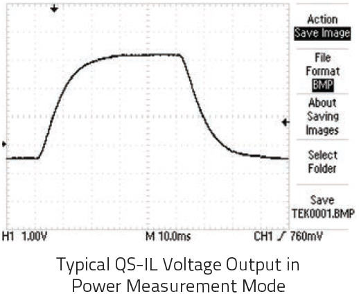 When using our QS-IL hybrid detector to measure the power (in watts) of your CW or high rep rate source (quasi-CW), you will need to employ an optical chopper. The diagram at the left shows the typical voltage output of a QS5-IL when used with our QS-I-TEST evaluation test box. Note that the voltage output is an approximate “square wave” whose rise and fall times are governed by the RC time constant of the circuit. The optical power is directly proportional to the peak voltage minus the baseline voltage. We calibrate these devices when operating in this mode.