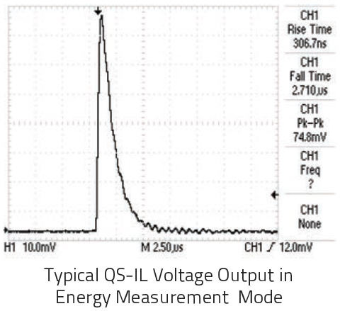 Our pyroelectric detectors are an ideal choice when measuring the performance of your pulsed laser in the range of nJ to mJ, across the full spectrum! The scope trace at the left represents the typical output from a QS9-IL, when used with our QS-I-TEST set up as an integrating joulemeter. Note the fast rise to a peak and then slower decay governed by the RC time constant selected for the integrating circuit. In this configuration you can measure absolute pulse energy, rep rate, and pulse-to-pulse stability. The maximum pulse width of your source is determined by the RC time constant you select and there is no limit as to how short the pulse can be!