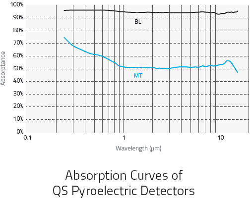 Unlike photoconductive and photovoltaic detectors, our pyroelectric thermal detectors are not limited to a small part of the electromagnetic spectrum. They are truly broad spectrum detectors, sensitive from 0.1 μm to 3000 μm (EUV, FAR IR, and THz). Any and all radiation absorbed by our coatings or pyro crystal will result in a measurable signal. The two plots at the left show the relative spectral response of detectors with MT and BL coatings. Note that the well documented, NIST traceable calibrated portion of these curves runs from 0.25 μm to 15 μm. There are currently no traceable optical standards for measurements > 15 μm.