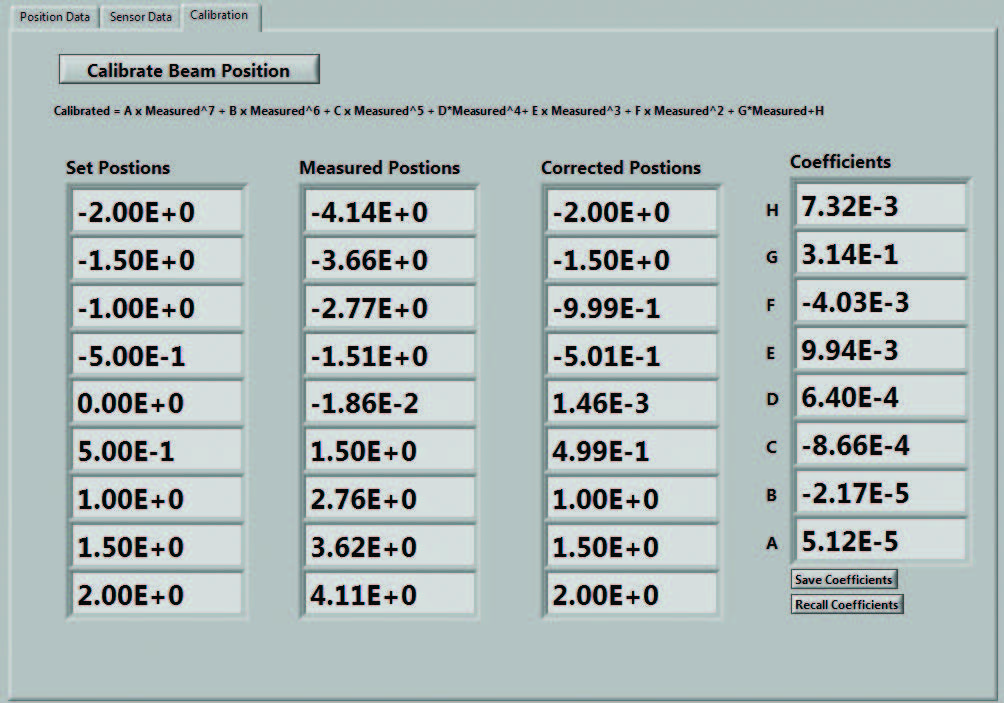 We've developed a unique position calibration routine which allows you to calibrate our QUAD-4TRACK system when working with a uniformly round laser beam. It requires the use of a micrometer-driven linear stage (1-axis only). As you can see from the calibration screen on the left, the procedure involves zeroing the instrument, moving the QUAD probe to nine discrete positions (+2.000 to - 2.000 mm) and then capturing the QUAD readings. It then determines correction coefficients (last column) and applies them to the raw data to arrive at "corrected positions". The QUAD probe is now calibrated!