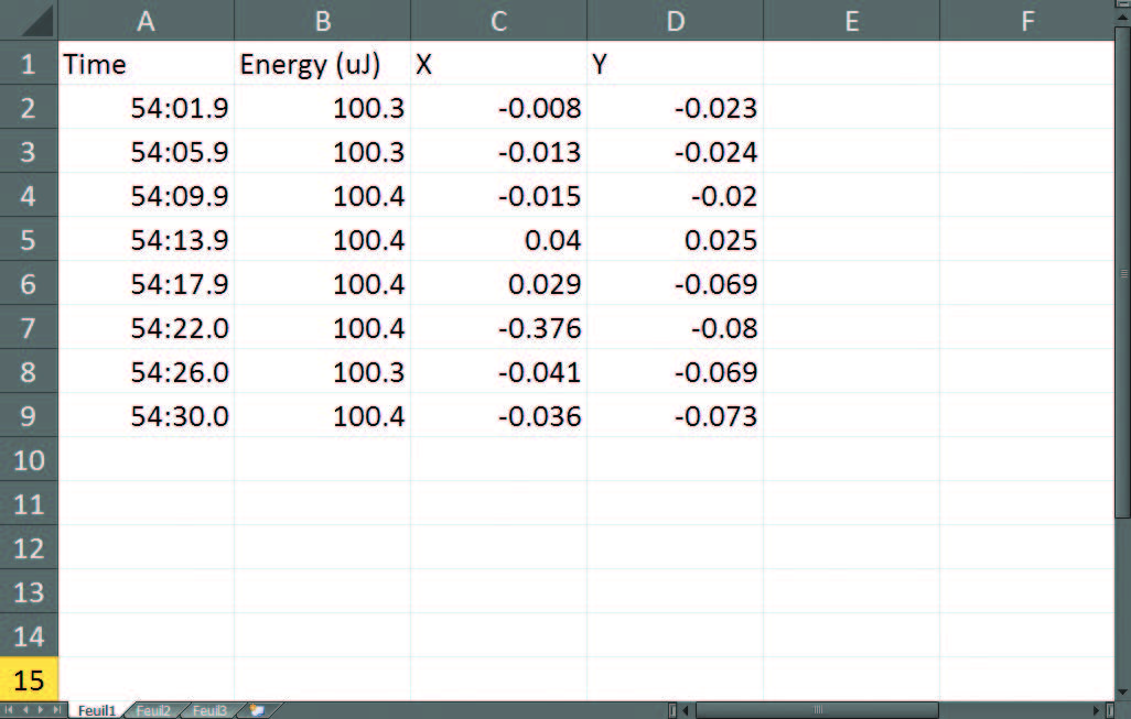 Another very handy feature is "data logging". This allows you to set up the QUAD-4TRACK to follow the displacement, energy and/or power of your laser over several minutes, hours or even days. Need to measure the "beam steering" of your laser as it warms up? This is how you do it! Need to measure the beam displacement vs laser repetition rate or energy level? Data logging will help you measure it!