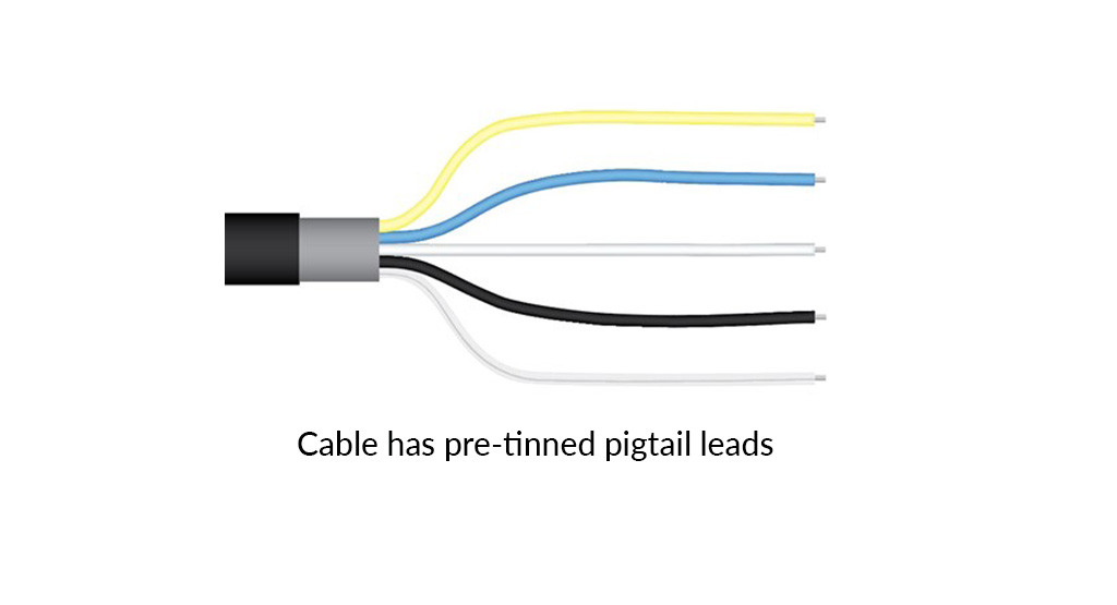 | Cable | 5 m of shielded, twisted-pair wire; TPR jacket (high water resistance, high UV stability, flexibility in cold conditions); pigtail lead wires; stainless steel (316), M8 connector |