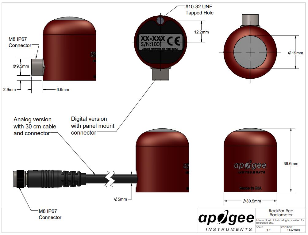 The analog version of this sensor (S2-131) comes with the inline cable connector placed 30 cm from the sensor head for either standard use as a long-cable pigtail sensor, or for use with our microCache Bluetooth Micro Logger by unscrewing the connector, discarding the long section of cable and then screwing the sensor to the mating connector on the microCache.