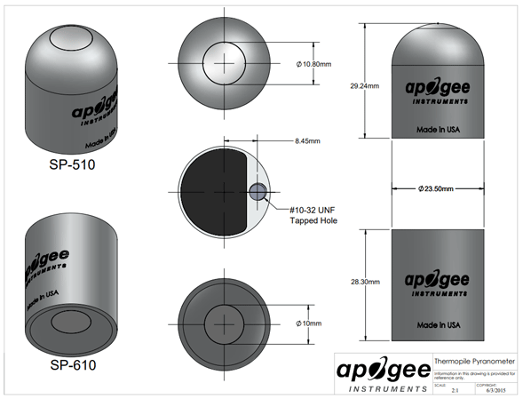Apogee Instruments SP-510 and SP-610 pyranometers consist of a thermopile detector, acrylic diffuser (SP-510) or glass window (SP-610), heater, and signal processing circuitry mounted in an anodized aluminum housing. For mounting to a mast or directly to a solar panel, we recommend using either the AL-130 Albedometer mounting bracket or the AM-500 Net Radiometer mounting bracket paired with an AM-130 mounting fixture with 12" rod.