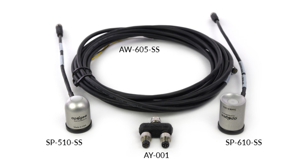 This promotional package includes a SP-510-SS thermopile pyranometer (upward-looking), a SP-610-SS thermopile pyranometer (downward-looking), an AY-001 differential splitter, and an AW-605-SS 5 meter cable.
