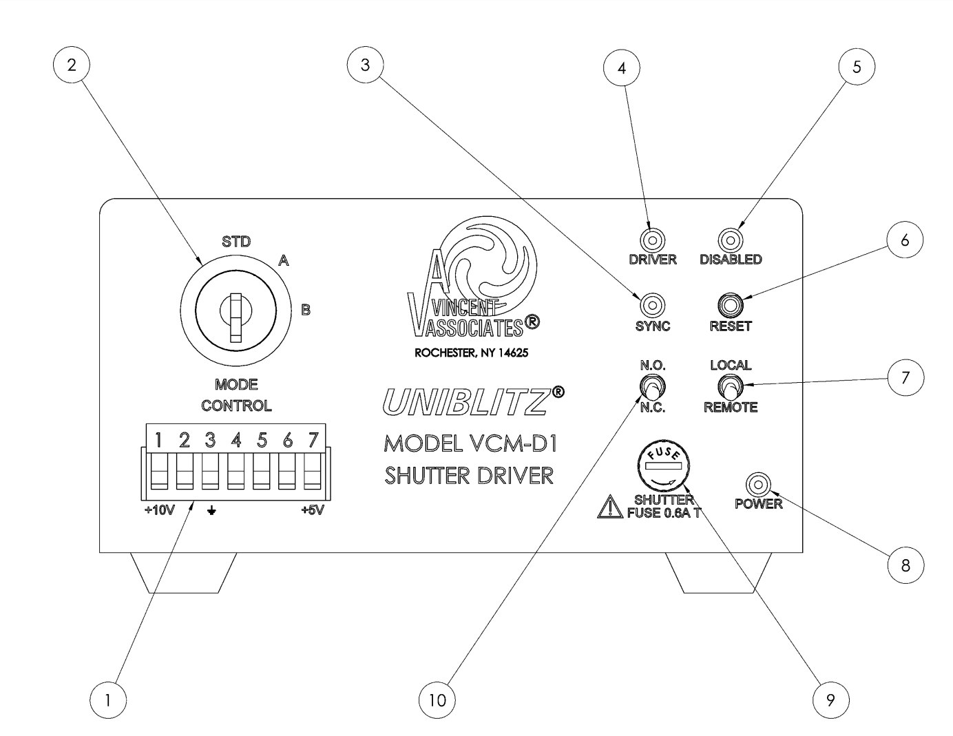 | N.O./N.C. Switch (10) | The position of this switch determines shutter status BEFORE a trigger signal is received by the VCM-D1. |