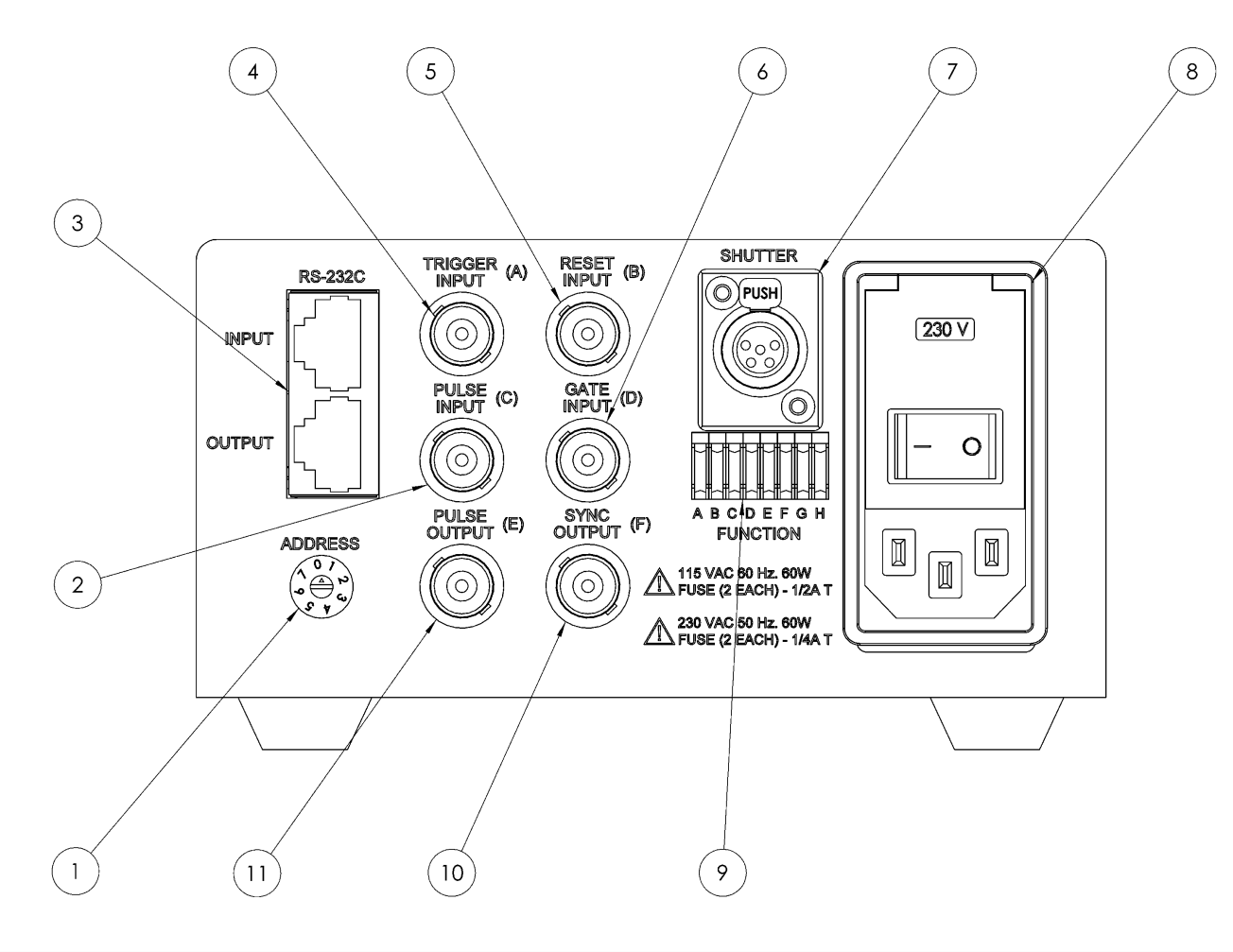 | Gate Input (6) | The presence of an active signal will enable trigger signals presented to the Trigger Input BNC. |