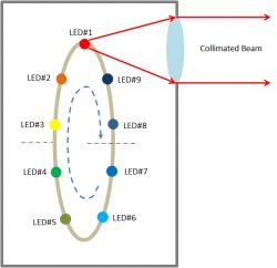 An optional focusing module can be mounted on the front of the LED collimator to focus light into a tight spot which is an image of the LED emitter.