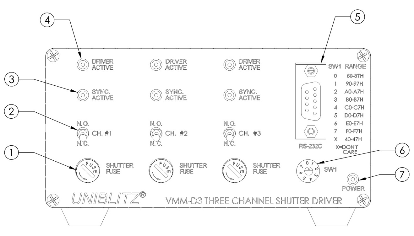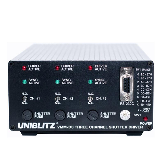 The Uniblitz VMM-D3 is a three-channel shutter driver capable of independently controlling up to three shutters. This compact design puts three complete, individual shutter drivers in a single, streamlined package. Active high-level logic inputs allow fully independent shutter control. A single input will activate all channels simultaneously, and a single output is available to monitor when all shutter synchronization system circuits are active. Three active low-level logic outputs monitor the status of each synchronization system output. An addressable RS232-C serial input is also available to control these inputs via a computer serial port, allowing up to eight VMM-D3 units and up to 24 individual shutters to be controlled from a single computer serial port.